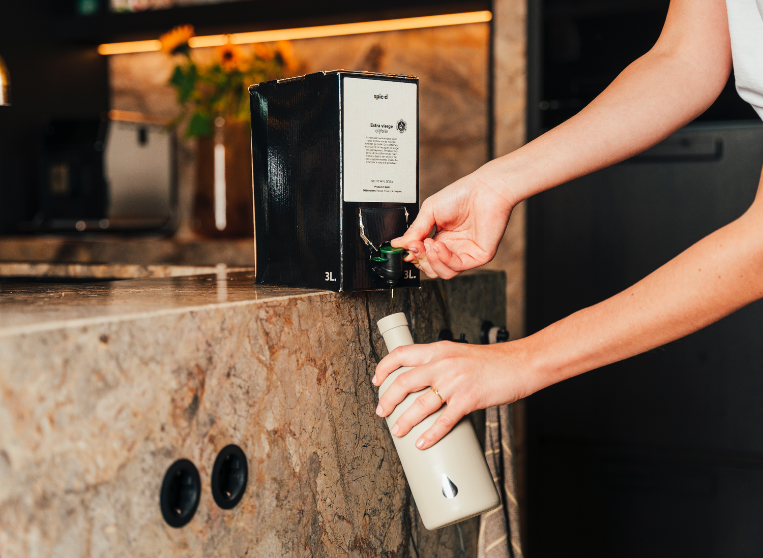 Voordelen van een refill-verpakking voor olijfolie. Daar is over nagedacht. Je koopt 'm in de webshop met de knop hieronder.