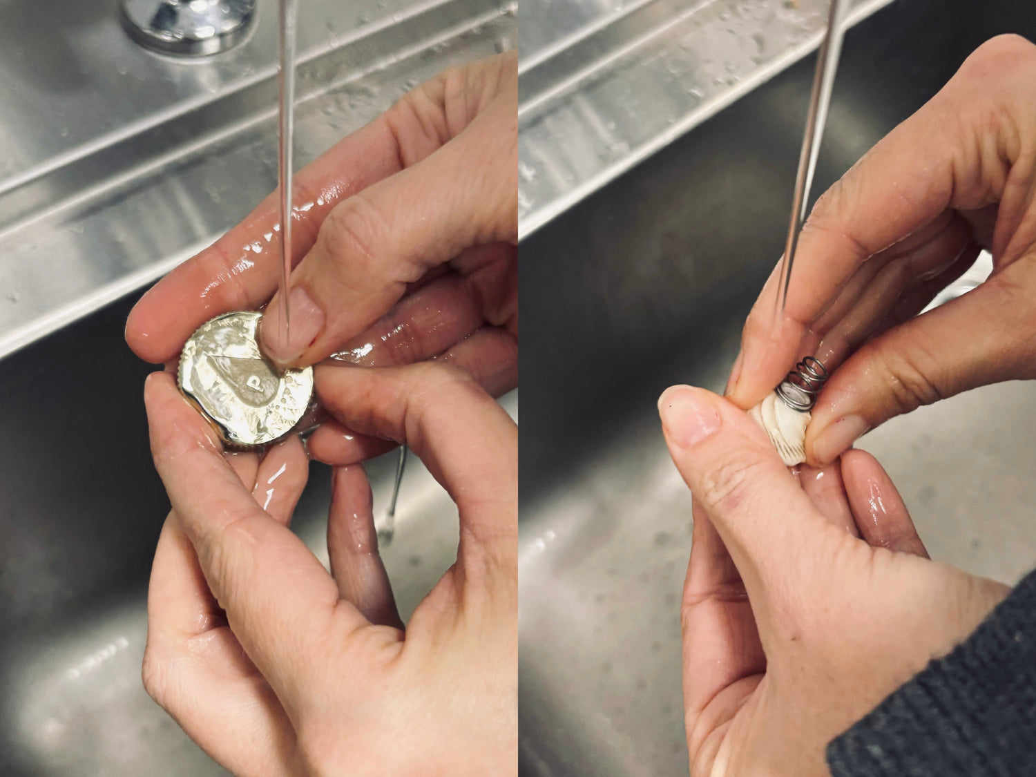 Now carefully clean the adjusting wheel and the white part with soapy water and a sponge or brush. Note: the parts cannot go in the dishwasher. When you are done with this, let them dry on a clean tea towel.